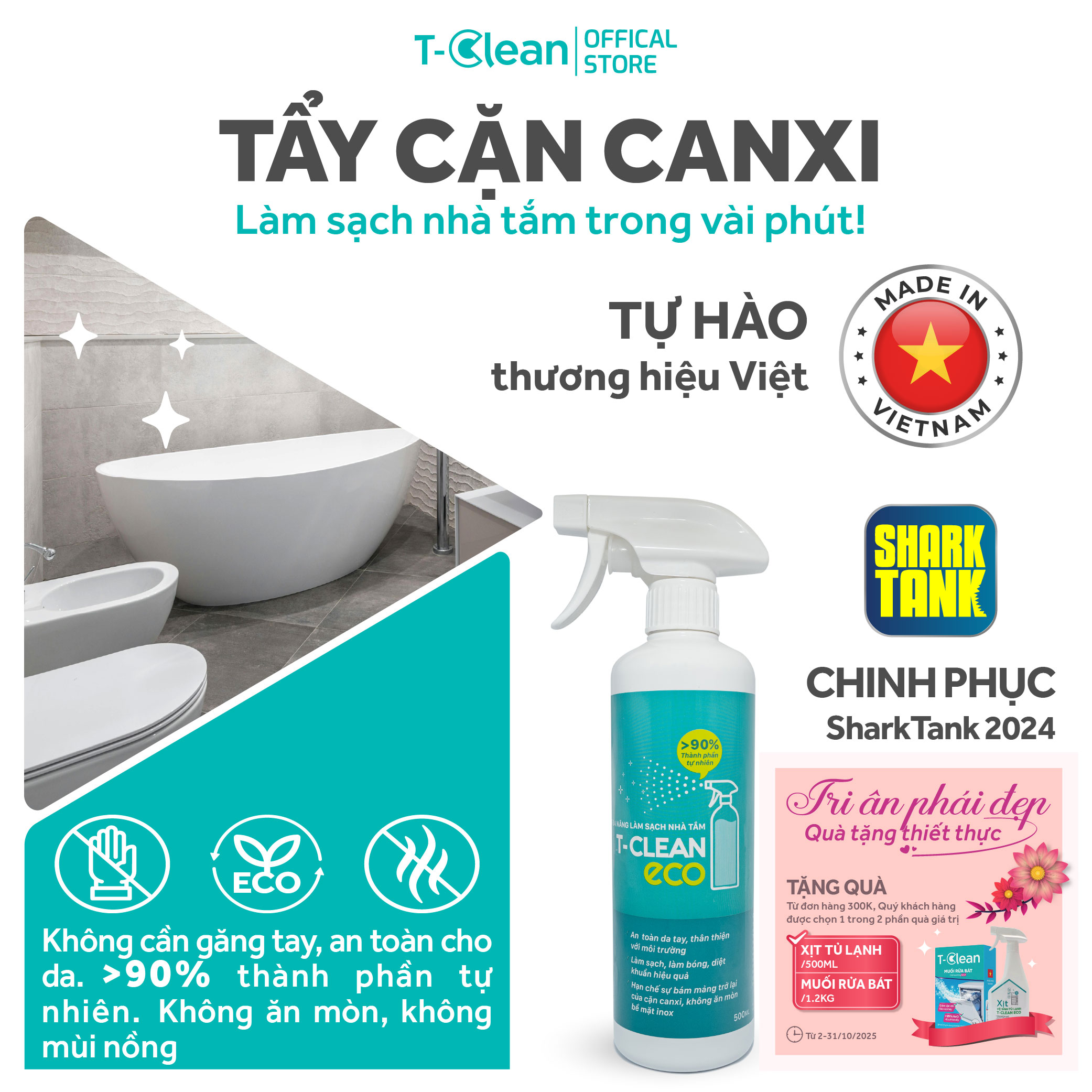 Xịt tẩy cặn canxi đa năng T-Clean 500ml là giải pháp chuyên biệt để làm sạch cặn vôi, cặn canxi, mảng bám nước cứng trên bề mặt nhà tắm như kính, vòi sen, lavabo, bồn cầu, gạch ốp tường… Công thức an toàn với thành phần gốc thực vật, giúp làm sạch hiệu quả mà không gây mùi nồng hoặc ăn mòn bề mặt.